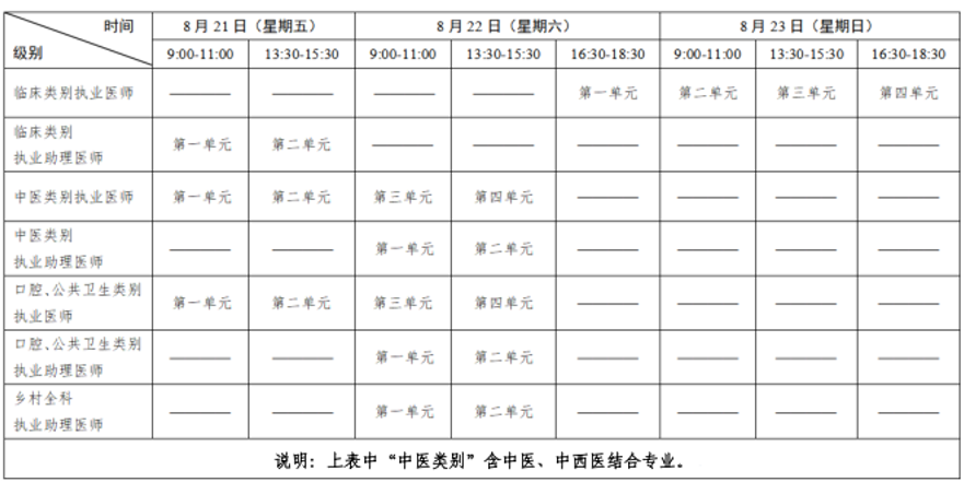 考试实行计算机化考试,军队现役人员、文职人员加试军事医学,院前急救岗位和儿科专业加试相应内容。统一考试时间如下: