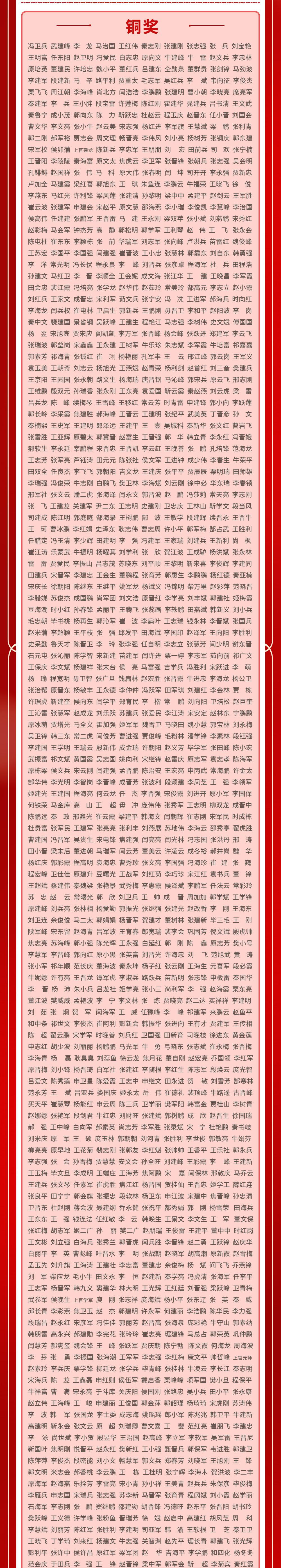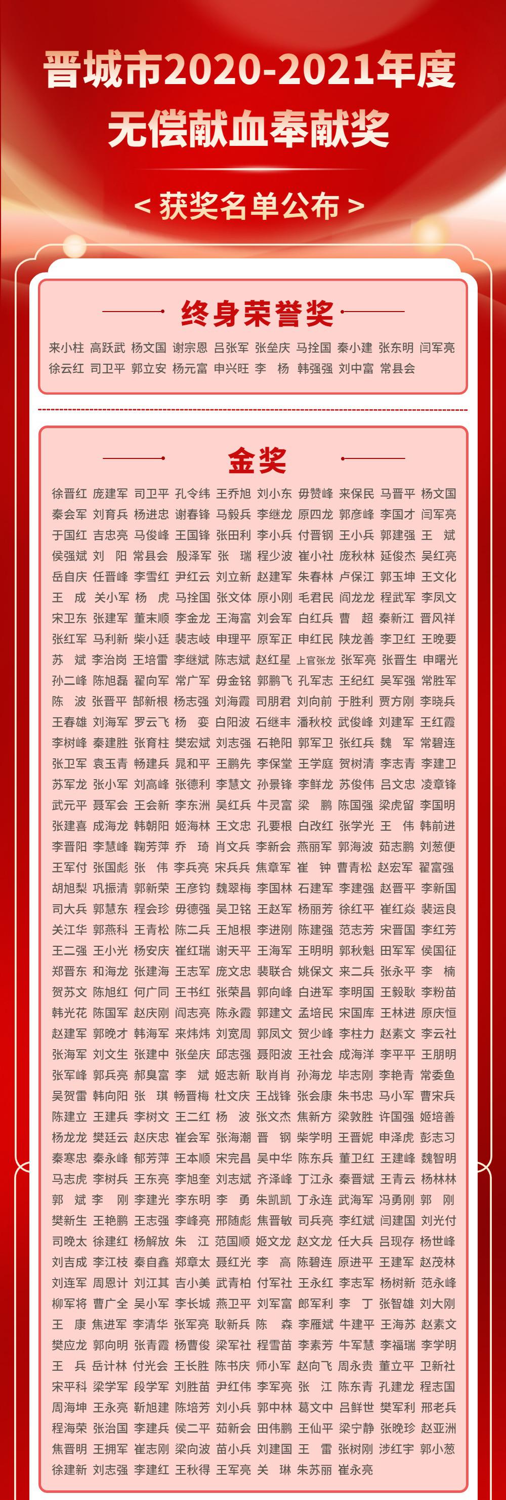 晋城市共有3240人获得“2020-2021年度无偿献血奉献奖”,其中终身荣誉奖19人、金奖478人、银奖887人、铜奖1856人;10人获得“无偿献血志愿服务奖”。获奖人数占全市总人口的1.5‰,位居全省前列。