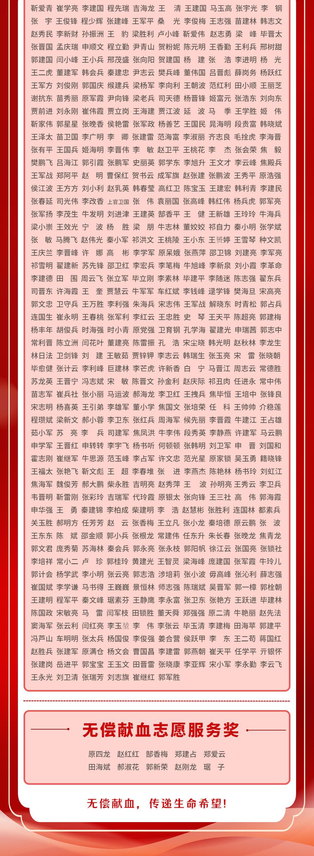 日前,国家卫生健康委、中国红十字会总会、中央军委后勤保障部卫生局联合发布《关于表彰2020—2021年度全国无偿献血表彰奖励获奖者的决定》,晋城市被授予“全国无偿献血先进市”称号。至此,晋城市已连续11次获此殊荣。