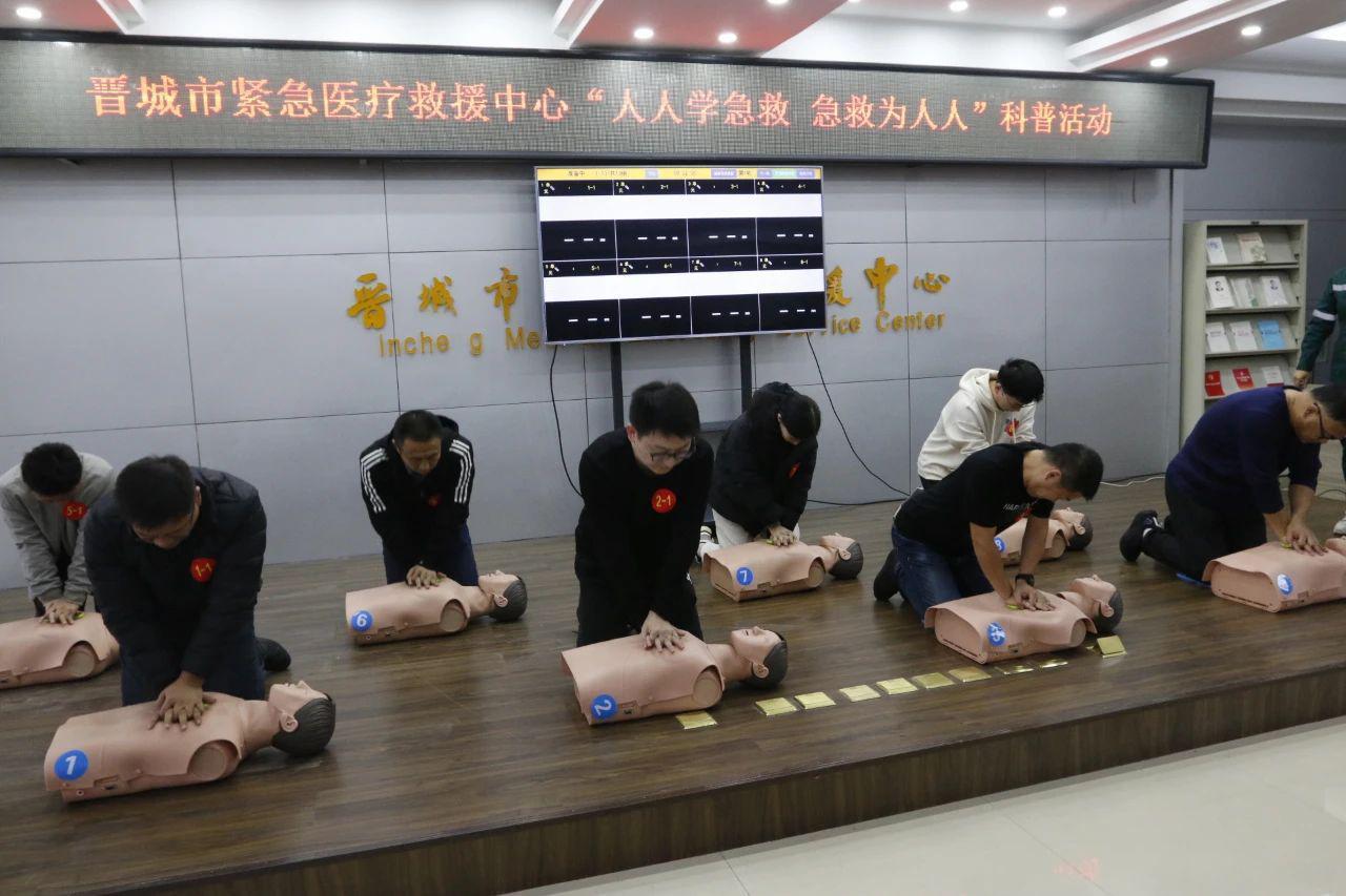 晋城市紧急医疗救援中心工作人员通过视频教学和现场演示,详细讲解了徒手心肺复苏术与AED的使用方法,并进行技能辅导。