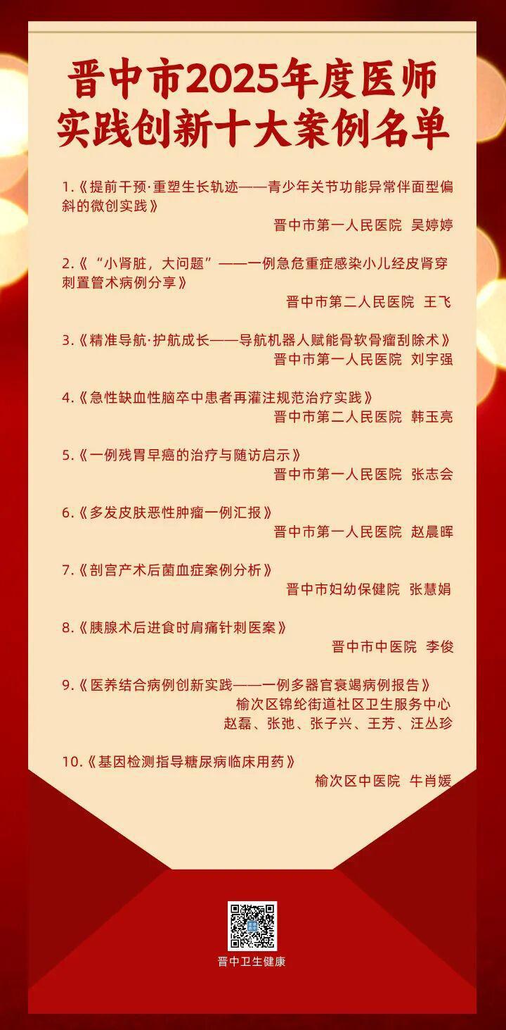近日,晋中市正式发布《2025年度医师实践创新优秀案例推选结果》,10项凝聚临床智慧与技术创新的一线实践案例脱颖而出,为区域诊疗水平提升提供了可复制、可推广的“晋中创新实践”。