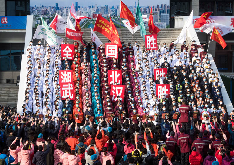 2020年3月10日,医护人员在武昌方舱医院前庆祝。当日,武汉所有方舱医院全部休舱。