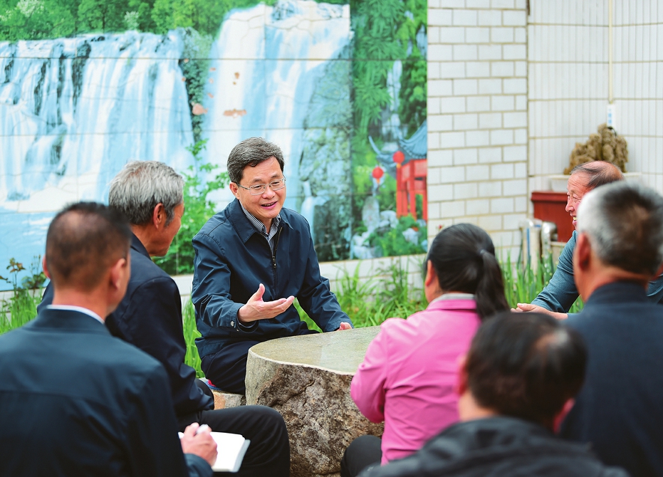 五月九日,省委书记蓝佛安在左权县麻田镇泽城村村民裴云家小院同当地群众和村干部围坐交流。