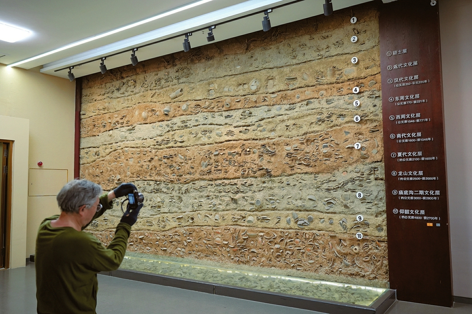 “墙上层层堆积的不仅仅是陶片,更是7000年历史长河中运城的厚重历史和灿烂文明。”讲解员燕晓静说,这面陶片墙共10层,最底层的是仰韶文化层,出土的彩陶距今约7000年至5000年。往上依次是庙底沟二期文化层、龙山文化层,以及夏、商、西周、东周、汉代、近代文化层等。