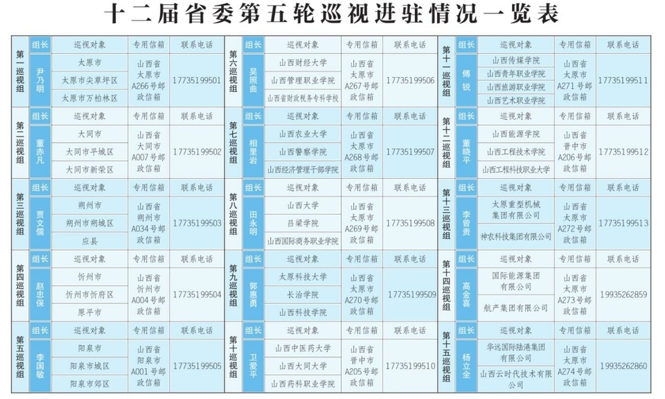 根据省委关于巡视工作统一部署,截至4月1日,十二届省委第五轮巡视完成进驻工作。15个巡视组将对太原、大同、朔州、忻州、阳泉5个市及所辖10个县(市、区)和山西大学等22所省管高校党委开展常规巡视,对太重集团等6家省属国企党委开展机动巡视。