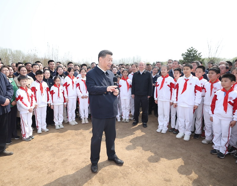 习近平在参加首都义务植树活动时强调 4月3日,党和国家领导人习近平、李强、赵乐际、王沪宁、蔡奇、丁薛祥、李希、韩正等来到北京市通州区潞城镇参加首都义务植树活动。 这是习近平同大家一起植树。 4月3日,党和国家领导人习近平、李强、赵乐际、王沪宁、蔡奇、丁薛祥、李希、韩正等来到北京市通州区潞城镇参加首都义务植树活动。 这是习近平同少先队员在一起。 中共中央总书记、国家主席、中央军委主席习近平3日上午在参加首都义务植树活动时强调,清明前后,神州大地处处生机盎然,正是植树的好时节。今天我们一起种树,就是要号召大家都行动起来,积极参与植树造林,人人争当绿色使者、生态先锋,为建设美丽中国增绿添彩,共同谱写人与自然和谐共生的中国式现代化新篇章。 京郊大地,春意正浓。上午10时40分许,党和国家领导人习近平、李强、赵乐际、王沪宁、蔡奇、丁薛祥、李希、韩正等集体乘车,来到北京市通州区潞城镇,同首都群众一起参加义务植树。 4月3日,党和国家领导人习近平、李强、赵乐际、王沪宁、蔡奇、丁薛祥、李希、韩正等来到北京市通州区潞城镇参加首都义务植树活动。 这是习近平扛起铁锹走向植树地点。 植树点地处北京市通州区与河北省廊坊市北三县交界地区,位于潮白河畔京冀首个跨界共建的森林公园内,具有良好的滨水生态条件。 看到总书记来了,正在植树的干部群众热情地向总书记问好。习近平向大家挥手致意,扛起铁锹走向植树地点,同北京市、国家林业和草原局负责同志以及首都干部群众、少先队员一起忙碌起来。 4月3日,党和国家领导人习近平、李强、赵乐际、王沪宁、蔡奇、丁薛祥、李希、韩正等来到北京市通州区潞城镇参加首都义务植树活动。 这是习近平同大家一起植树。 4月3日,党和国家领导人习近平、李强、赵乐际、王沪宁、蔡奇、丁薛祥、李希、韩正等来到北京市通州区潞城镇参加首都义务植树活动。 这是习近平同少先队员一起给刚栽下的树苗浇水。 挥锹铲土、培土围堰、提水浇灌……习近平接连种下油松、黄栌、元宝枫、樱桃、红叶碧桃、侧柏等多棵树苗。习近平一边植树,一边询问孩子们的学习生活、劳动锻炼情况。他强调,广大青少年是祖国的未来,从小要积极参加劳动、植树造林,把绿色的种子种进心里,养成尊重自然、热爱自然的意识,勤奋学习、锻炼身体、茁壮成长,德智体美劳全面发展,努力成为国家栋梁。植树现场一派热火朝天的劳动景象,领导同志们同大家一起培土浇水,气氛热烈。 4月3日,党和国家领导人习近平、李强、赵乐际、王沪宁、蔡奇、丁薛祥、李希、韩正等来到北京市通州区潞城镇参加首都义务植树活动。 这是习近平同参加植树的干部群众、少先队员亲切交谈。 植树期间,习近平同在场的干部群众亲切交谈。他说,到中央工作后,他已连续17年参加首都义务植树活动。他指出,今年是新中国植树节设立45周年。全国人民坚持植树造林,荒山披锦绣,沙漠变绿洲,成就举世瞩目。同时要看到,我国缺林少绿问题仍然突出,森林“宝库”作用发挥还不够充分。增绿就是增优势,植树就是植未来。要一茬接着一茬种,一代接着一代干,不断增厚我们的“绿色家底”。 4月3日,党和国家领导人习近平、李强、赵乐际、王沪宁、蔡奇、丁薛祥、李希、韩正等来到北京市通州区潞城镇参加首都义务植树活动。 这是习近平同少先队员在一起。 习近平强调,绿化祖国要扩绿、兴绿、护绿并举。扩绿,就是要科学推进大规模国土绿化,适地适树、适时适法,种一棵活一棵、造一片成一片。兴绿,就是要注重质量效益,拓展绿水青山转化为金山银山的路径,推动森林“水库、钱库、粮库、碳库”更好联动,实现生态效益、经济效益、社会效益相统一。护绿,就是要加强林草资源保护,做好防灭火工作,深入开展重大隐患排查整治,守护好来之不易的绿化成果。三北地区是国土绿化的主战场,要把更多力量集中到“三北”工程建设上来,筑牢北疆绿色长城。 4月3日,党和国家领导人习近平、李强、赵乐际、王沪宁、蔡奇、丁薛祥、李希、韩正等来到北京市通州区潞城镇参加首都义务植树活动。 这是习近平同少先队员在一起。 习近平指出,绿化祖国要人人尽责。要畅通群众参与渠道、创新尽责形式,发挥好林长制作用,把各方面力量调动起来,推动全民义务植树不断走深走实。 在京中共中央政治局委员、中央书记处书记、国务委员等参加植树活动。