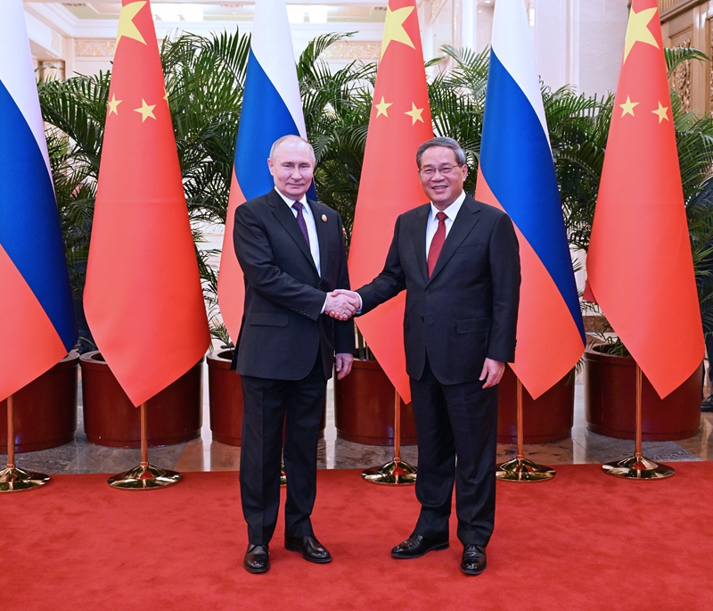 国务院总理李强5月16日下午在北京人民大会堂会见来华进行国事访问的俄罗斯总统普京。