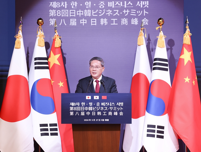 当地时间5月27日中午,国务院总理李强在首尔与韩国总统尹锡悦、日本首相岸田文雄共同出席第八届中日韩工商峰会并致辞。 当地时间5月27日中午,国务院总理李强在首尔与韩国总统尹锡悦、日本首相岸田文雄共同出席第八届中日韩工商峰会并致辞。 李强表示,习近平主席用“亲诚惠容”4个字,凝练概括了中国的周边外交理念。中日韩在地理上一衣带水,决定了我们应当做和平友爱的近邻。要以史为鉴、面向未来,顺应三国人民安居乐业的意愿,努力排除外部干扰,始终和谐相处、和衷共济。中日韩在经济上深度融合,决定了我们应当做携手发展的近邻。要把彼此视作发展道路上的亲密伙伴和重要机遇,不断发掘三国经济的优势互补点、合作增长点,实现更高水平的互利共赢。中日韩在文化上渊源相通,决定了我们应当做心灵契合的近邻。要用好文化上的共鸣,把它作为促进理解、增进信任、密切合作的催化剂、黏合剂。中方愿同韩方、日方携手努力,持续深化各领域交流合作,不断促进利益相融、人民相亲、命运相连,带动本地区一体化加速推进,进一步开创和平稳定、发展繁荣的新局面。 李强表示,广大企业家在推动中日韩经贸及各领域交流合作中都发挥着重要作用。希望大家把握经济全球化大势,深化产业协作,不断提升互联互通水平和要素配置效率,用好中国国际供应链促进博览会平台,做产业链供应链稳定的维护者。把握世界科技革命和产业变革大势,加强联合研发、协同攻关,共同推动技术进步和产业竞争力提升,做深化创新合作的推动者。把握人类文明交融发展大势,充分发挥桥梁纽带作用,积极支持民间交往,做拓展人文交流的促进者。 韩、日领导人表示,韩日中三国经贸合作取得巨大成果,有力促进了全球经济发展。三国政府和工商界应当齐心协力,进一步深化三国经贸合作,促进青年等人文交流,增进区域投资合作,通过“韩日中+X”加强与“全球南方”国家合作,共同应对气候变化等全球性问题,为推动三国和全球经济发展作出积极贡献。 三国工商界和政府代表约240人出席峰会。 吴政隆出席上述活动。