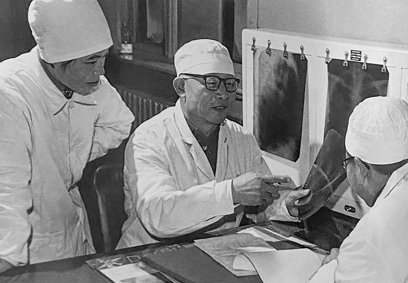 1980年1月16日,中日友好医院首任院长辛育龄(中)在内蒙古结核病院与胸外科医师讨论病例(翻拍照片)。