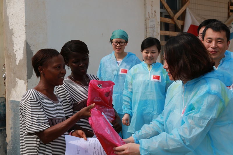 中国第四批援塞医疗队副队长邵蔚(右前)向被治愈的埃博拉出血热患者赠送礼物。