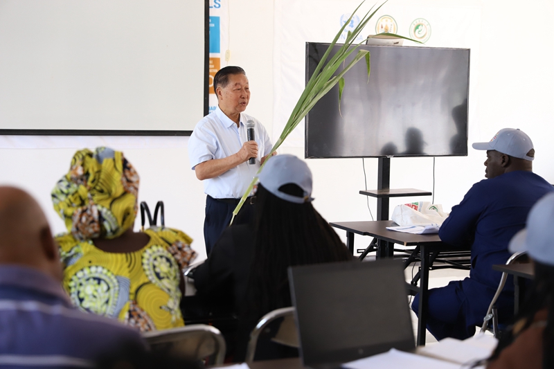 2024年8月4日,在位于卢旺达南方省胡耶区的中国援卢农业技术示范中心,菌草发明人林占熺为培训班学员讲解菌草技术。