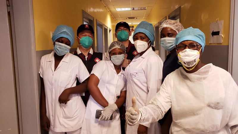 2020年5月26日,中国抗疫医疗专家组在刚果(布)首都布拉柴维尔指导新冠肺炎病房建设时,与当地一线医务人员合影。
