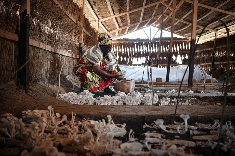 2024年2月6日,在中非共和国达马拉,法蒂玛在菇棚内收获菌草菇。