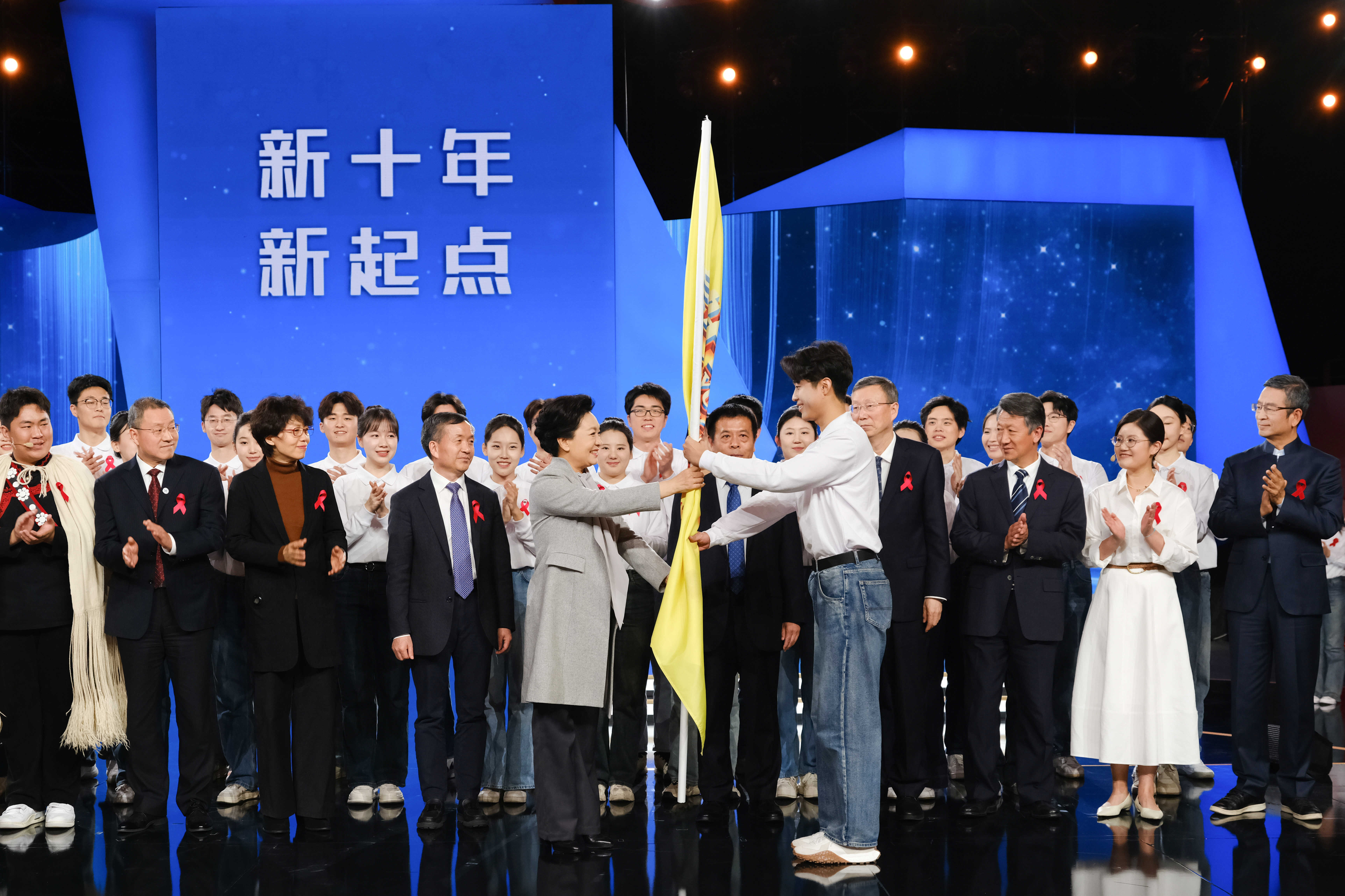 彭丽媛教授为大学生防艾志愿者代表授旗