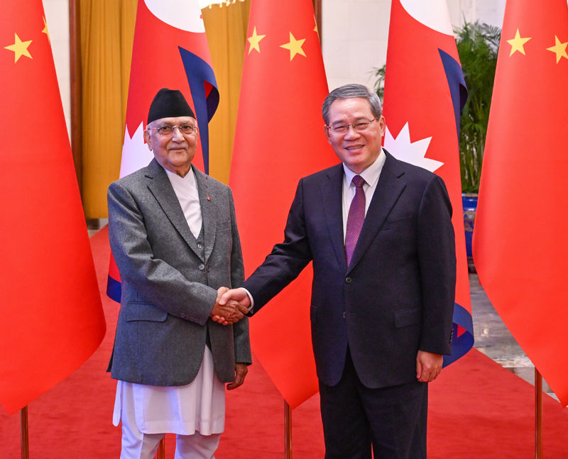 李强表示,中尼是山水相连的传统友邻。两国建交近70年来,双边关系保持健康稳定发展,特别是2019年中尼建立面向发展与繁荣的世代友好的战略合作伙伴关系,带动双方各领域交流合作有力拓展,为两国人民带来了实实在在的福祉。习近平主席将同总理先生举行会晤,为进一步深化两国关系作出新的战略规划。中方愿同尼方落实好两国领导人重要共识,持续巩固深化政治互信,推动中尼关系与合作不断向纵深发展,构建更加紧密的中尼命运共同体,更好惠及两国人民。
