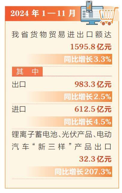 前11个月,我省锂离子蓄电池、光伏产品、电动汽车“新三样”产品出口32.3亿元,同比增长207.3%。农产品出口17.8亿元,同比增长49%。其中,水果出口8774批次、14.4万吨,同比分别增长38.6%、3.8%,我省14大类、73种水果出口到78个国家和地区。