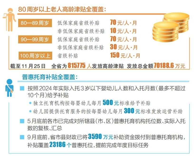 “每个月都能领到养老金,今年每个月又新加70元的高龄津贴,儿女孝顺,日常生活没有问题,咱真的是赶上了好时代。”12月13日中午,正在交城县夏家营镇夏家营村日间照料中心用餐的村民陈占武一边吃饭,一边和身边的几个老伙计夸赞如今的幸福生活。 今年83岁的陈占武是一位地地道道的农民。在地里忙碌一辈子的他,怎么也没想到自己老了不仅能领养老金,还能在80多岁的时候再领到一笔额外的高龄津贴。 如今,陈占武一有空就去村里的日间照料中心,下棋、聊天。“人老了就图个生活安稳,有饭吃有钱花,就很知足了。感谢党和政府给我们老年人提供了这么好的福利,让我们晚年生活更有保障。”陈大爷的体会,也是村里老人们的共同心声。 2023年5月,国家基本养老服务清单要求为80周岁及以上老年人发放高龄津贴。为推动这一政策在我省尽快落地,今年政府工作报告专门将实现“一老一幼”普惠补贴全覆盖,列为15件民生实事之一。3月,省民政厅下发《关于加快推进高龄津贴政策落地的通知》,并每月召开一次视频调度会议通报各地的落实进度。如今,该项政策已经惠及我省80周岁以上的老人。 省民政厅相关负责人介绍,目前高龄津贴的发放标准是按照80—89周岁、90—99周岁和100周岁以上3个年龄段分别给予不同金额的补贴。截至11月25日,全省共为815775名老年人发放高龄津贴。 党的二十届三中全会提出:“以应对老龄化、少子化为重点完善人口发展战略,健全覆盖全人群、全生命周期的人口服务体系,促进人口高质量发展。”在实现高龄津贴全覆盖、保障老有所养的同时,我省积极落实支持政策,对执行政府指导价的普惠性托育机构补贴全覆盖,保障幼有所育,为构建生育友好型社会提供支持。 对于这项托育惠民政策,长治市潞州区市民宋亚妮体会很深。“我和丈夫平时上班都比较忙,家里老人年纪也都比较大,照顾孩子是我们面临的最大难题。”今年3月,长治市潞州区公办综合托育中心正式运营后,抱着试试看的心态,宋亚妮和爱人将还不到一岁半的孩子送进了托小班。9个月时间里,宋亚妮不仅减轻了带娃负担,也对孩子在托小班的成长和进步感到非常满意。 “普惠性托育机构不仅要托得下、托得好,更重要的是要让老百姓能托得起。”省卫生健康委相关负责人介绍,我省已连续两年将普惠性托育服务工作纳入民生实事予以保障。2023年实现了全省117个县(市、区)公办示范性综合托育机构建设全覆盖,2024年实现对执行政府指导价的普惠性托育机构补贴全覆盖。对审核认定的普惠性托育机构按照2024年实际入托3岁以下婴幼儿人数和入托月数(最多不超过10个月)给予补贴,对独立托育机构按每婴幼儿每月500元标准给予补贴,幼儿园提供托育服务的按每婴幼儿每月300元标准发放运营补助。据统计,今年9月底前,省市县财政已补贴覆盖23186个普惠托位,提前完成年度目标任务。