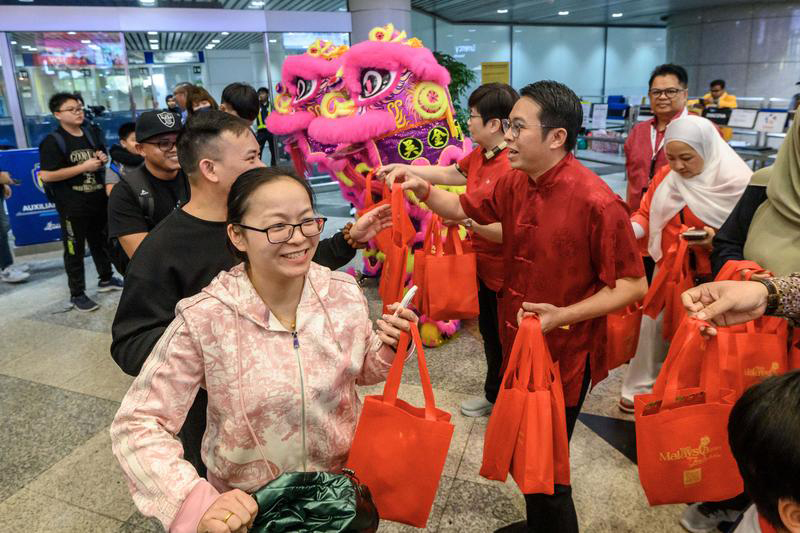 1月29日,在马来西亚吉隆坡国际机场,马来西亚旅游局工作人员为游客派送小礼品。