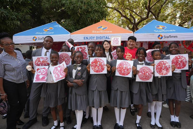 1月25日,在尼日利亚首都阿布贾举行的“欢乐春节”庙会上,当地的老师和学生展示剪纸作品。