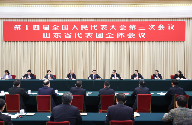 3月5日下午,国家副主席韩正来到他所在的山东代表团,同代表们一起审议政府工作报告。