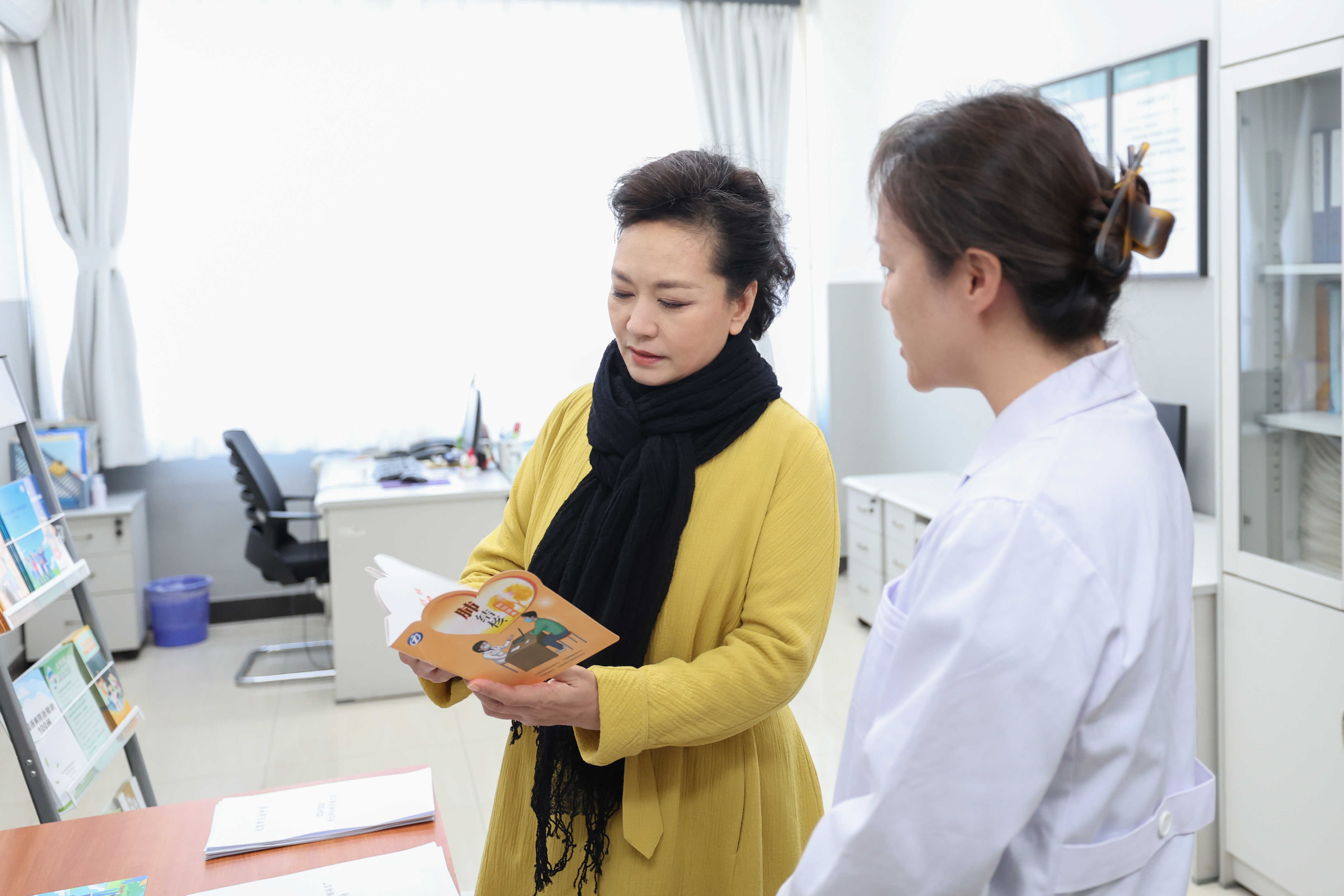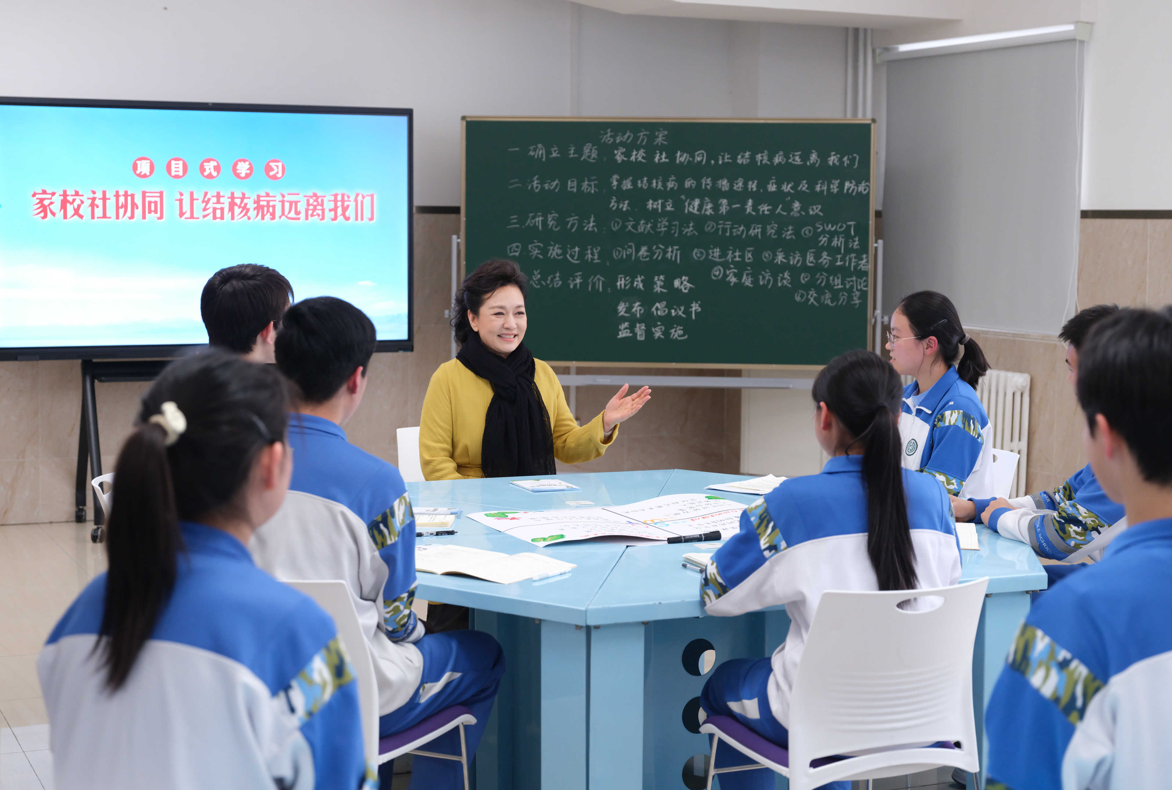 彭丽媛在日坛中学参与结核病防治主题社会调研讨论。