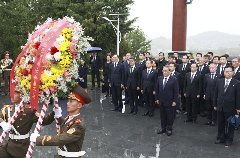 在中国人民志愿军抗美援朝出国作战75周年之际,当地时间10月10日下午,中共中央政治局常委、国务院总理李强专程赴安州中国人民志愿军烈士陵园凭吊烈士。