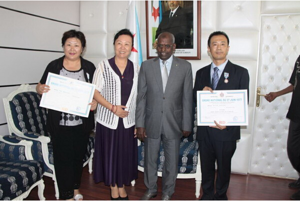 吉布提总理卡米勒为王振日和贾梅君佩戴了勋章。卡米勒总理说,吉布提政府感谢中国政府多年来对吉布提政府给予多方面的援助和支持,感谢你们对吉布提人民健康所做的贡献。