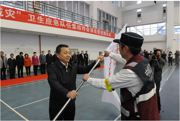 5月10日,省卫生计生委举行“5.12防灾减灾”卫生应急队伍集结待命演练暨授旗仪式。省政协副主席、省卫生计生委主任卫小春任现场总指挥,并为各卫生应急队伍授队旗。