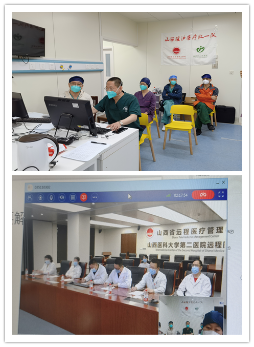 医疗队与山西后方阵地积极联系,通过山西省远程会诊平台,积极开展危重患者的在线远程会诊,努力为患者提供更加精准、更加科学、更加有效的诊疗服务。目前已通过远程会诊,为6名新冠肺炎危重症和合并症患者,实施了更加科学有效的诊疗,并取得了显著的诊疗效果。