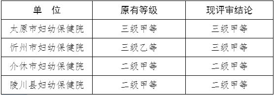 根据《国家卫生计生委关于妇幼保健服务机构标准化建设与规范化管理的指导意见》、《国家卫生计生委关于印发三级和二级妇幼保健院评审标准(2016年版)的通知》和《国家卫生计生委办公厅关于印发三级和二级妇幼保健院评审标准实施细则(2016年版)的通知》要求,2019—2020年省卫生健康委组织专家对4所妇幼保健机构进行了等级评审。经2020年10月23日省卫生健康委医疗机构评审领导小组审议,现对评审结果公示如下: