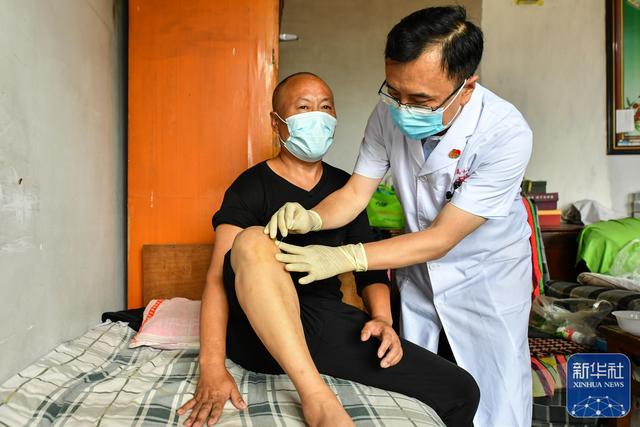 7月6日,山西省长治市壶关县大河村的“第一村医”杜斌(右)为村民诊疗。
