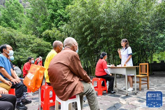 7月6日,长治医学院和平医疗集团“第一村医”壶关县工作队的医生赵甘婷(右一)在为大峡谷镇卫生院的村医们上课。 为解决偏远乡村医疗力量相对薄弱的问题,山西省长治市推出“第一村医”工作机制,由长治医学院和平医疗集团抽调业务骨干组建工作队,为市内5个县区所辖的24个乡镇开展走村入户的医疗帮扶工作。从2020年9月至今,长治医学院和平医疗集团先后派出3批共108名“第一村医”,在77个帮扶村内开展健康宣教、集中义诊、入户医疗帮扶、乡村医生培训等活动。 7月6日,山西省长治市壶关县大河村的“第一村医”杜斌(右)为村民诊疗。 7月6日,长治医学院和平医疗集团“第一村医”壶关县工作队队长刘杰英(右一)在为大峡谷镇群众宣讲健康知识。