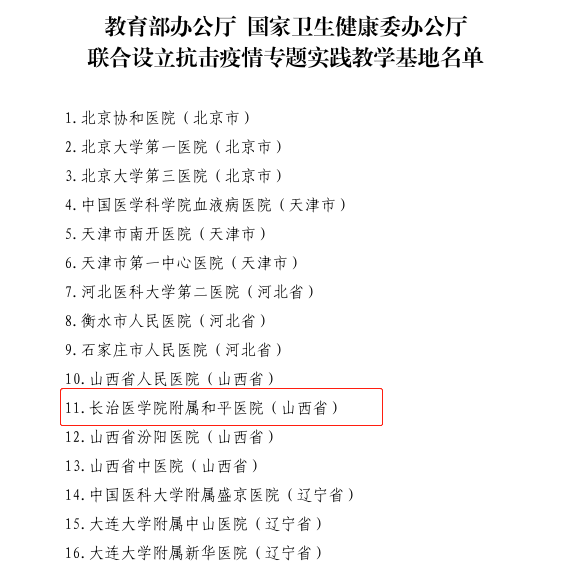 此次公布的“大思政课”实践教学基地分科学精神专题实践教学基地、文化专题实践教学基地、美丽中国专题实践教学基地等7大类,长治医学院附属和平医院入选“抗击疫情专题实践教学基地”。据悉,全国入选该基地共65所医院,山西省共入选4所。