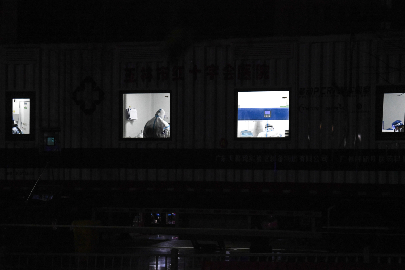 2月13日夜,检测人员在移动核酸检测车内工作。