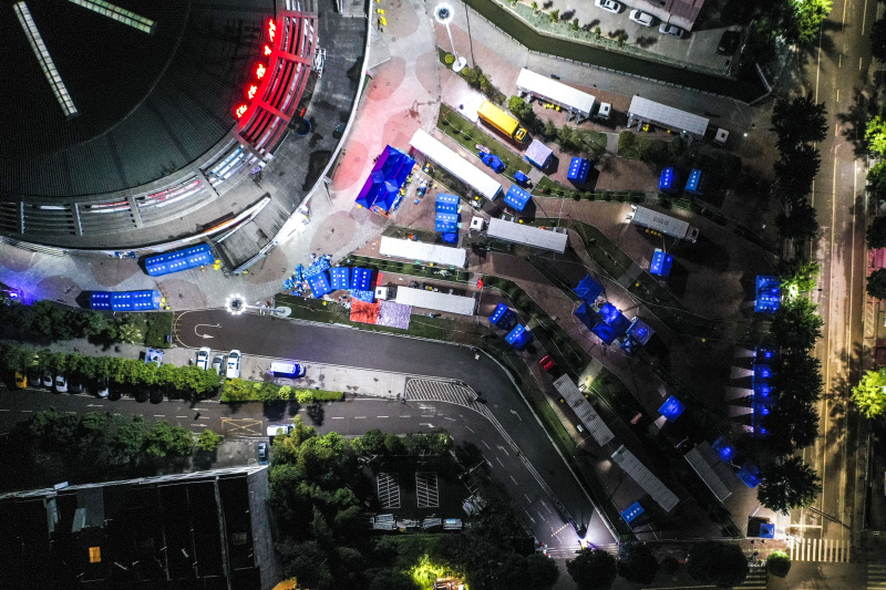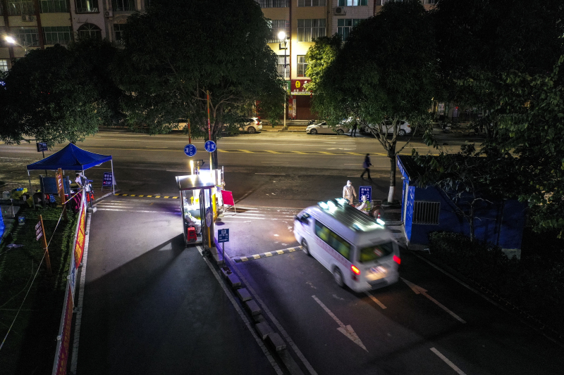 2月13日夜间,急救车在当地紧张转运核酸检测样本(无人机照片)。