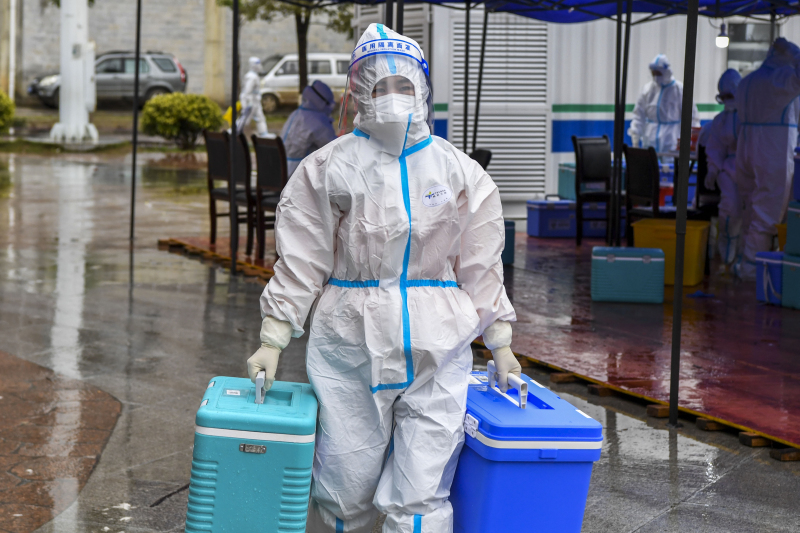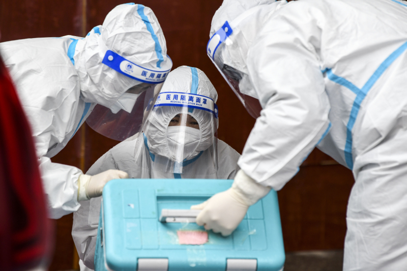 2月13日,工作人员在气膜实验室内转移医疗废弃物。