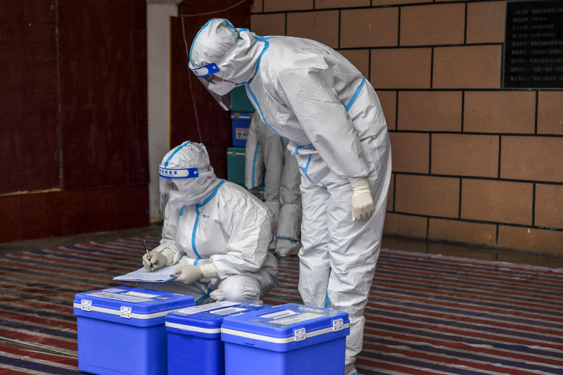 2月13日,工作人员在核对核酸样本转运箱的信息。