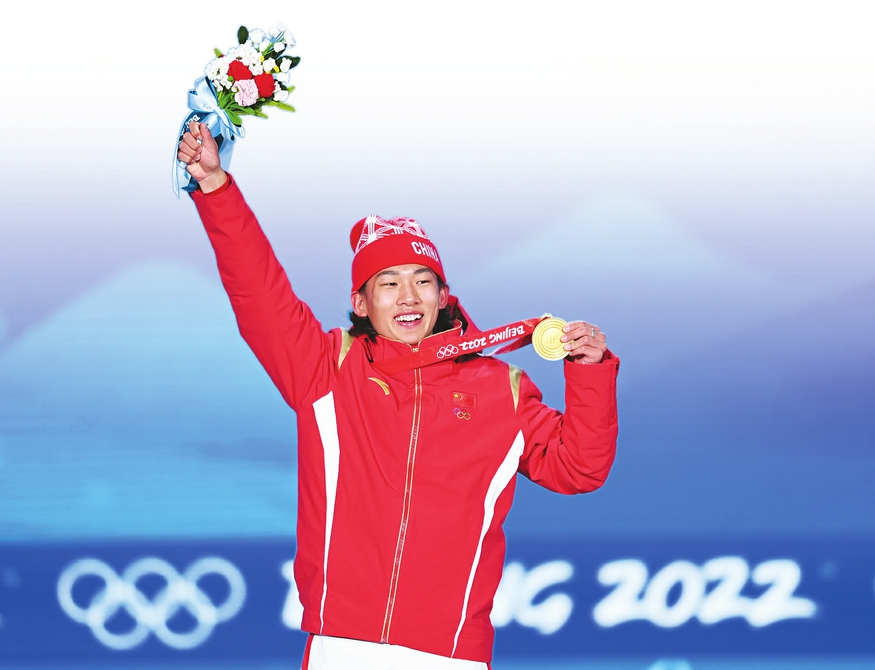 我国首枚冬奥会单板滑雪男子大跳台金牌 我国最年轻的冬奥会冠军 2月15日,北京2022年冬奥会单板滑雪男子大跳台决赛在首钢滑雪大跳台举行。山西选手苏翊鸣以总分182.50的成绩获得金牌,成为我国历史上最年轻的冬奥会冠军。这也是中国首枚冬奥会单板滑雪男子大跳台金牌、中国体育代表团在本届冬奥会上获得的第六枚金牌。 当天的首钢园,天空湛蓝。12名选手进入决赛,资格赛以第5名闯进决赛的苏翊鸣,出场顺序排在第8位。在第一轮表现不错的情况下,苏翊鸣在第二轮中选择了内转1800度+INDY抓板动作,完成后稳稳落地,这一完美表现征服了裁判,得到了93.00分。直至苏翊鸣的最后一跳前,都没有对手能够超越这一成绩,所以苏翊鸣第三轮还未进行就已锁定冠军。 “我在很小的时候就有夺冠的梦想,希望能够在冬奥会上取得好的成绩,为祖国争光。今天通过努力,我做到了。这也是给我自己18岁最好的生日礼物。感谢祖国、感谢父母和教练的培育,今天这块金牌的获得,离不开所有人对我的支持。”苏翊鸣在赛后表示。