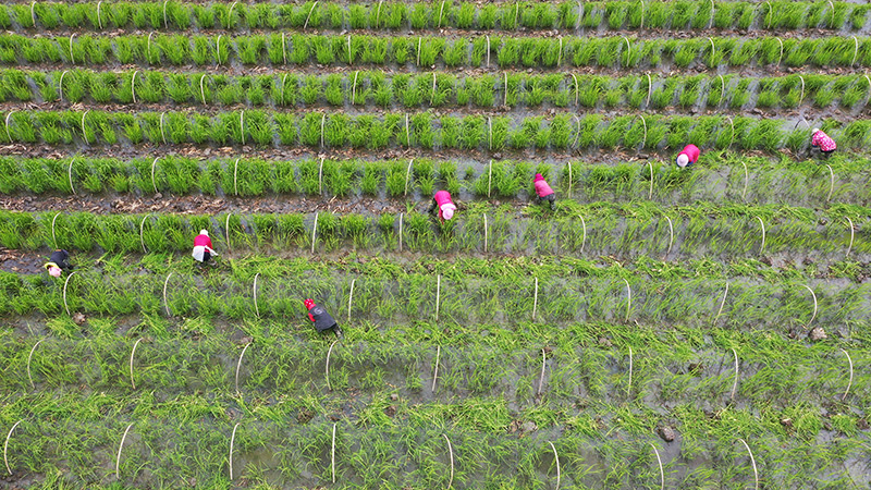 2023年2月23日,浙江省温岭市新河镇农民进行茭白秧苗春季管理(无人机照片)。