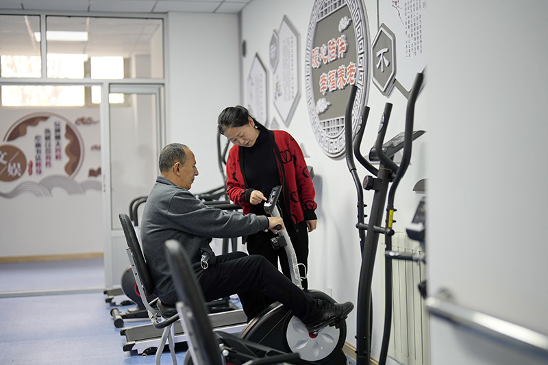 2023年4月16日,老年人在唐山市丰南区胥各庄镇一处社区养老服务中心内健身。