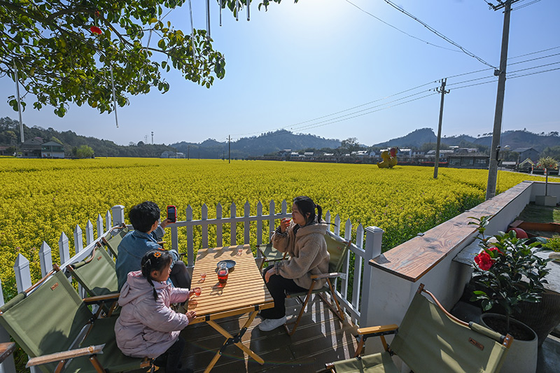 2023年3月28日,在杭州市临安区太阳镇太阳米基地旁的一家民宿餐厅,客人在院子里喝茶赏景。
