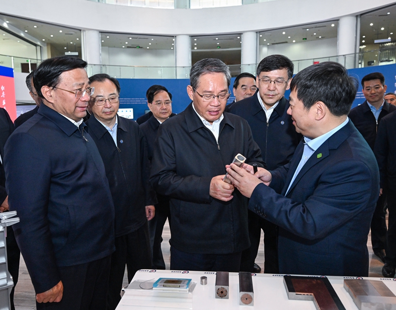 这是李强在中国科学技术大学先进技术研究院听取科技创新及成果转化情况汇报,参观科研设备和技术产品展示。