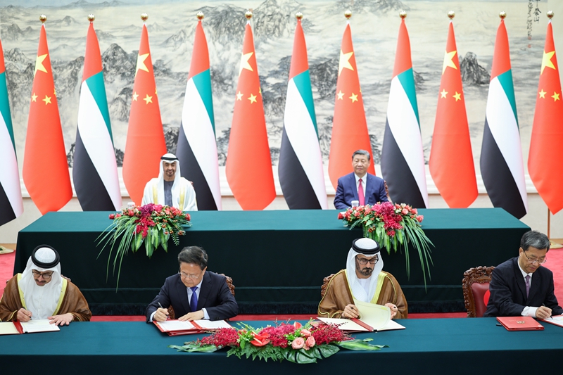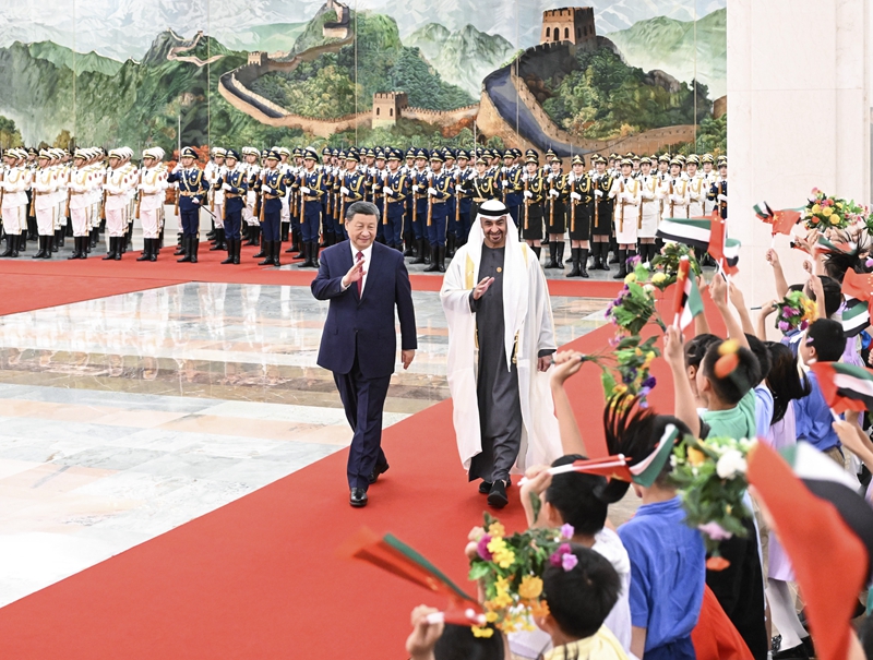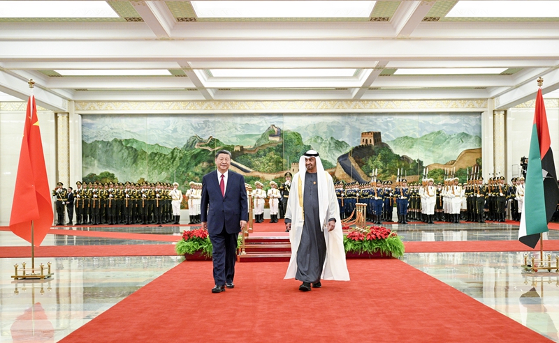 5月30日下午,国家主席习近平在北京人民大会堂同来华国事访问并 出席中国-阿拉伯国家合作论坛第十届部长级会议开幕式的阿联酋总统穆罕默德举行会谈。这是习近平同穆罕默德握手。 5月30日下午,国家主席习近平在北京人民大会堂同来华国事访问并出席中国-阿拉伯国家合作论坛第十届部长级会议开幕式的阿联酋总统穆罕默德举行会谈。 习近平指出,阿联酋是中国重要的全面战略伙伴。近年来,在我们共同引领下,中阿关系保持良好发展势头,树立了新时期中国和阿拉伯国家关系的典范。今年是中阿两国建交40周年,是中阿关系承上启下、继往开来的重要节点。中方愿同阿方一道,继续从战略高度和长远角度牢牢把握两国关系大方向,确保中阿全面战略伙伴关系始终蓬勃发展。 5月30日下午,国家主席习近平在北京人民大会堂同来华国事访问并 出席中国-阿拉伯国家合作论坛第十届部长级会议开幕式的阿联酋总统穆罕默德举行会谈。 这是会谈前,习近平在人民大会堂北大厅为穆罕默德举行欢迎仪式。 习近平强调,中方支持阿联酋走独立自主的发展道路,支持阿方维护国家主权、安全、发展利益,愿同阿方巩固政治互信,加强合作,携手构建中阿命运共同体。中方愿同阿方持续推进高质量共建“一带一路”,加强发展战略对接,以建立中阿投资合作高级别委员会为契机,推动两国合作取得更多成果。巩固贸易、能源、基础设施等领域合作,拓展信息技术、人工智能、数字经济、新能源等高技术领域合作。加强执法安全合作。前不久,我专门给阿联酋中文学习者回信,勉励他们学好中文、了解中国,为促进中阿友好作出贡献。中方愿继续支持“百校教中文”项目,推进阿联酋中国文化中心建设,加强人文交流,增进彼此了解和友谊。 5月30日下午,国家主席习近平在北京人民大会堂同来华国事访问并 出席中国-阿拉伯国家合作论坛第十届部长级会议开幕式的阿联酋总统穆罕默德举行会谈。 这是会谈前,习近平在人民大会堂北大厅为穆罕默德举行欢迎仪式。 习近平指出,当前,世界多极化趋势不可阻挡。多极化本质上应该是不同文明、不同制度、不同道路之间相互尊重、和平共处。中东地区国家是发展中国家的重要组成部分,是世界多极化的重要力量。中方支持地区国家继续走符合本国国情的发展道路,坚定走团结自强、和平和解之路,坚持通过沟通协商化解分歧,把前途命运掌握在自己手中。中方愿同阿联酋等阿拉伯国家一道努力,办好第二届中国-阿拉伯国家峰会,推进中国和阿拉伯国家命运共同体建设。中方愿同阿方加强中海战略伙伴关系,拓展多边合作,维护“全球南方”国家共同利益。 5月30日下午,国家主席习近平在北京人民大会堂同来华国事访问并 出席中国-阿拉伯国家合作论坛第十届部长级会议开幕式的阿联酋总统穆罕默德举行会谈。 这是会谈前,习近平在人民大会堂北大厅为穆罕默德举行欢迎仪式。 穆罕默德表示,很高兴再次访问我的第二故乡中国并同习近平主席共同出席中国-阿拉伯国家合作论坛第十届部长级会议开幕式。阿拉伯国家和海湾国家同中国的关系有着深厚基础,不断深化发展阿中关系、海中关系符合阿拉伯国家和海湾国家人民的共同愿望和根本利益。阿方愿同中方共同努力,推动阿中、海中关系更好造福双方人民。 穆罕默德表示,阿联酋同中国关系建立在相互信任、相互尊重和共同利益的基础之上,各领域合作达到非凡水平。阿联酋高度重视发展对华关系,将中国置于外交最优先位置,将中国作为长期可靠的战略合作伙伴,愿以庆祝两国建交40周年为契机,进一步深化拓展经贸、投资、能源、科技、教育、人文等各领域合作。阿联酋政府坚定奉行一个中国政策,反对任何形式的“台独”,支持中国为实现国家统一所作的努力。阿方高度赞赏、积极支持习近平主席提出的全球发展倡议、全球安全倡议、全球文明倡议,将继续积极参加共建“一带一路”,愿同中方密切多边沟通协作,为促进地区和世界的和平、发展与繁荣作出积极努力。 5月30日下午,国家主席习近平在北京人民大会堂同来华国事访问并 出席中国-阿拉伯国家合作论坛第十届部长级会议开幕式的阿联酋总统穆罕默德举行会谈。 双方还就巴以冲突交换意见。习近平强调,当务之急是全面停火止战,缓解人道主义危机。国际社会应该一致支持巴勒斯坦问题在“两国方案”基础上早日通过谈判解决。中阿双方在巴勒斯坦问题上立场一致,应该共同努力,推动巴勒斯坦问题得到全面、公正、持久解决。 会谈后,两国元首共同见证签署关于投资、共建“一带一路”、科技、和平利用核能、中文教育、文化旅游等领域多项双边合作文件。 5月30日下午,国家主席习近平在北京人民大会堂同来华国事访问并 出席中国-阿拉伯国家合作论坛第十届部长级会议开幕式的阿联酋总统穆罕默德举行会谈。 这是会谈后,两国元首共同见证签署多项双边合作文件。 会谈前,习近平在人民大会堂北大厅为穆罕默德举行欢迎仪式。 天安门广场鸣放21响礼炮,礼兵列队致敬。两国元首登上检阅台,军乐团奏中阿两国国歌。穆罕默德在习近平陪同下检阅中国人民解放军仪仗队,并观看分列式。 5月30日下午,国家主席习近平在北京人民大会堂同来华国事访问并 出席中国-阿拉伯国家合作论坛第十届部长