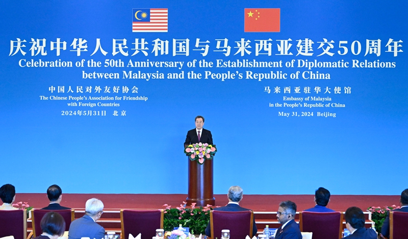 中共中央政治局常委、国务院副总理丁薛祥31日在北京出席中国-马来西亚建交50周年庆祝招待会并致辞。 丁薛祥指出,中马传统友谊源远流长。建交50年来,双方坚定不移发展友好关系,始终坚持睦邻友好、互利共赢、交流互鉴、团结协作,给两国人民带来切实利益,也为地区繁荣稳定作出重要贡献。 5月31日,中共中央政治局常委、国务院副总理丁薛祥在北京出席中国-马来西亚建交50周年庆祝招待会并致辞。 丁薛祥表示,2023年3月,习近平主席同安瓦尔总理就共建中马命运共同体达成重要共识,为新时期两国关系发展擘画了新蓝图。双方要继续做彼此信赖的好兄弟、共谋发展的好朋友、相亲相近的好邻居、多边协作的好伙伴,以建交50周年为契机,携手迈上共建中马命运共同体的新征程,共同开创中马关系更加辉煌的下一个50年。 马来西亚第一副总理兼乡村及区域发展部长扎希德在致辞中表示,马中建交50周年是重要里程碑。马方愿同中方深化合作、同舟共济,推动马中友好永续长流。 招待会前,丁薛祥会见了扎希德。双方一致表示,以共建中马命运共同体为指引,巩固政治互信,深化发展战略对接,拓展产业、科技、农业、人文等领域交流合作,加强地区和国际事务沟通协调,推动中马全面战略伙伴关系再上新台阶。 招待会由中国人民对外友好协会和马来西亚驻华大使馆共同举办,两国各界友好人士300余人出席。