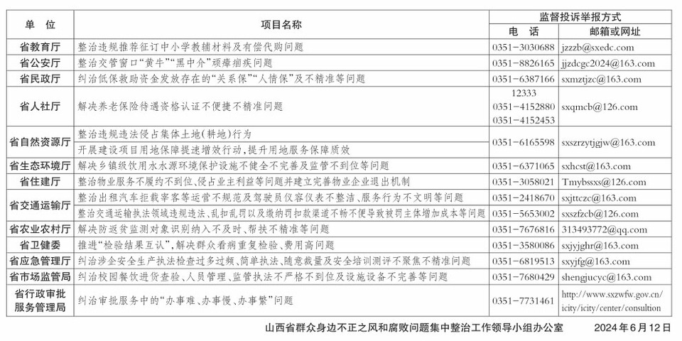 全省开展群众身边不正之风和腐败问题集中整治工作以来,省纪委监委在狠抓纠风治乱、严查“蝇贪蚁腐”的同时,聚焦教育、医疗、养老、社保、食品安全、生态环保等民生领域,推动13个省直部门确定了15项“听民意办实事”项目,集中力量解决一批群众急难愁盼问题,办成一批群众可感可及的实事。为广泛听取群众意见,受理群众投诉,接受群众监督,现将责任单位、整治项目、监督投诉举报方式等集中公布如图: