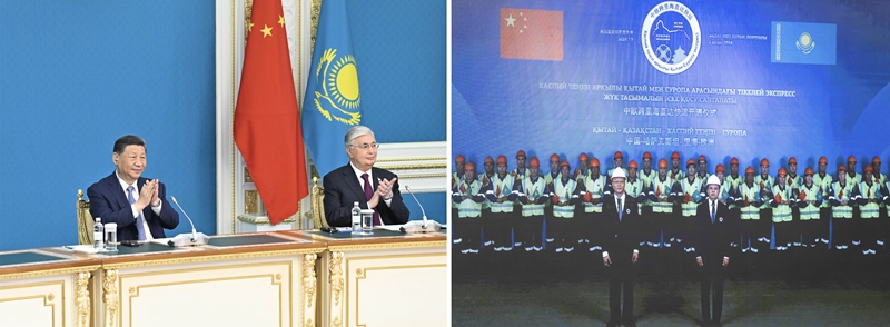 当地时间7月3日中午,国家主席习近平同哈萨克斯坦总统托卡耶夫在阿斯塔纳总统府以视频方式共同出席中欧跨里海直达快运开通仪式(拼版照片)。