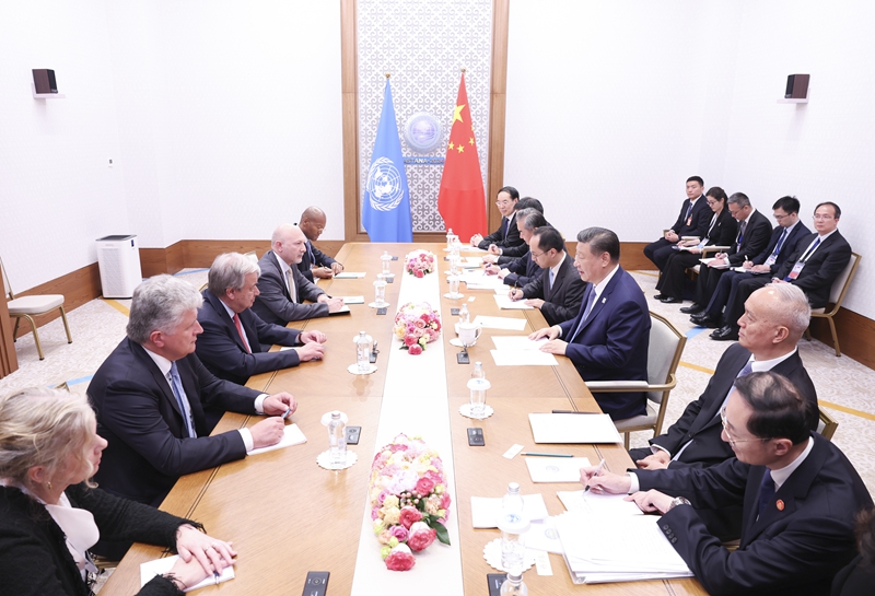 当地时间7月4日下午,国家主席习近平在阿斯塔纳出席上海合作组织峰会期间会见联合国秘书长古特雷斯。