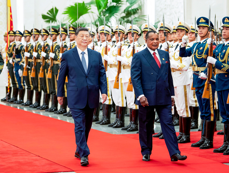 9月6日上午,国家主席习近平在北京人民大会堂同来华出席中非合作论坛北京峰会并进行国事访问的刚果(布)总统萨苏举行会谈。