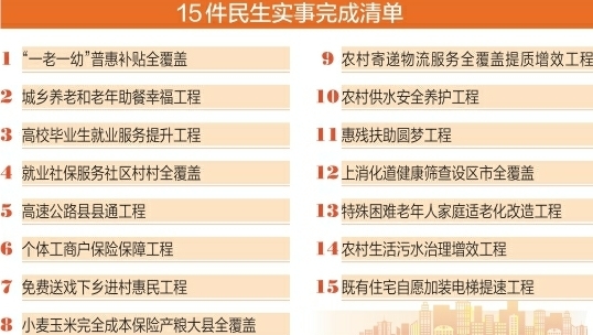 15件民生实事件件关乎民生福祉,涉及养老托育、就业社保、疾病筛查、乡村振兴、环境治理等百姓家事和发展大事,着眼解决群众急难愁盼问题,着力补齐城乡公共服务短板,加强普惠性、基础性、兜底性民生建设,切实增强群众获得感幸福感安全感。