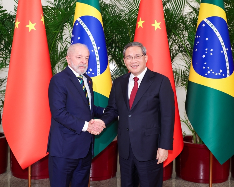5月13日下午,国务院总理李强在北京人民大会堂会见来华进行国事访问的巴西总统卢拉。 李强表示,中巴建交50多年来,始终相互尊重、相互支持,是同舟共济、共同发展的好朋友、好伙伴。当前,在两国元首战略引领下,中巴关系进入发展“黄金期”。习近平主席将同总统先生举行会谈,为推动中巴命运共同体建设进一步擘画蓝图。中方愿同巴方一道努力,保持高层交往,深化政治互信,不断丰富两国关系的战略内涵,全方位拓展双方互利合作,在实现现代化的道路上并肩前行、彼此成就。 5月13日下午,国务院总理李强在北京人民大会堂会见来华进行国事访问的巴西总统卢拉。 李强指出,当前国际形势复杂多变,中巴同为发展中大国和全球重要新兴经济体,应当更加紧密团结协作,携手抵御风险挑战,实现更高水平的互利共赢。中方愿同巴方加强发展战略对接,发挥产业结构互补优势,发掘更多利益契合点,深化金融、贸易投资、基础设施、产业链、绿色转型等领域合作,打造更多旗舰项目。双方要加强人工智能、数字经济、先进制造、生物医药等领域合作,持续壮大两国务实合作的创新动能。中方愿同巴方密切多边沟通协调,继续坚定维护联合国的中心地位,践行真正的多边主义,推进平等有序的世界多极化和普惠包容的经济全球化,推动构建人类命运共同体,为维护世界和平稳定贡献重要力量。 卢拉表示,当前巴中关系保持高水平发展,携手构建更公正世界和更可持续星球的巴中命运共同体建设卓有成效。巴方高度重视发展对华关系,愿同中方进一步密切高层交往,加强巴西发展战略同“一带一路”倡议对接,深化金融、基础设施建设、产业链、农业、航天、医药、人工智能等领域互利合作。巴方愿同中方密切多边沟通协作,支持多边主义,共同抵制单边主义、保护主义,捍卫国家主权,促进全球南方共同发展。 吴政隆参加会见。